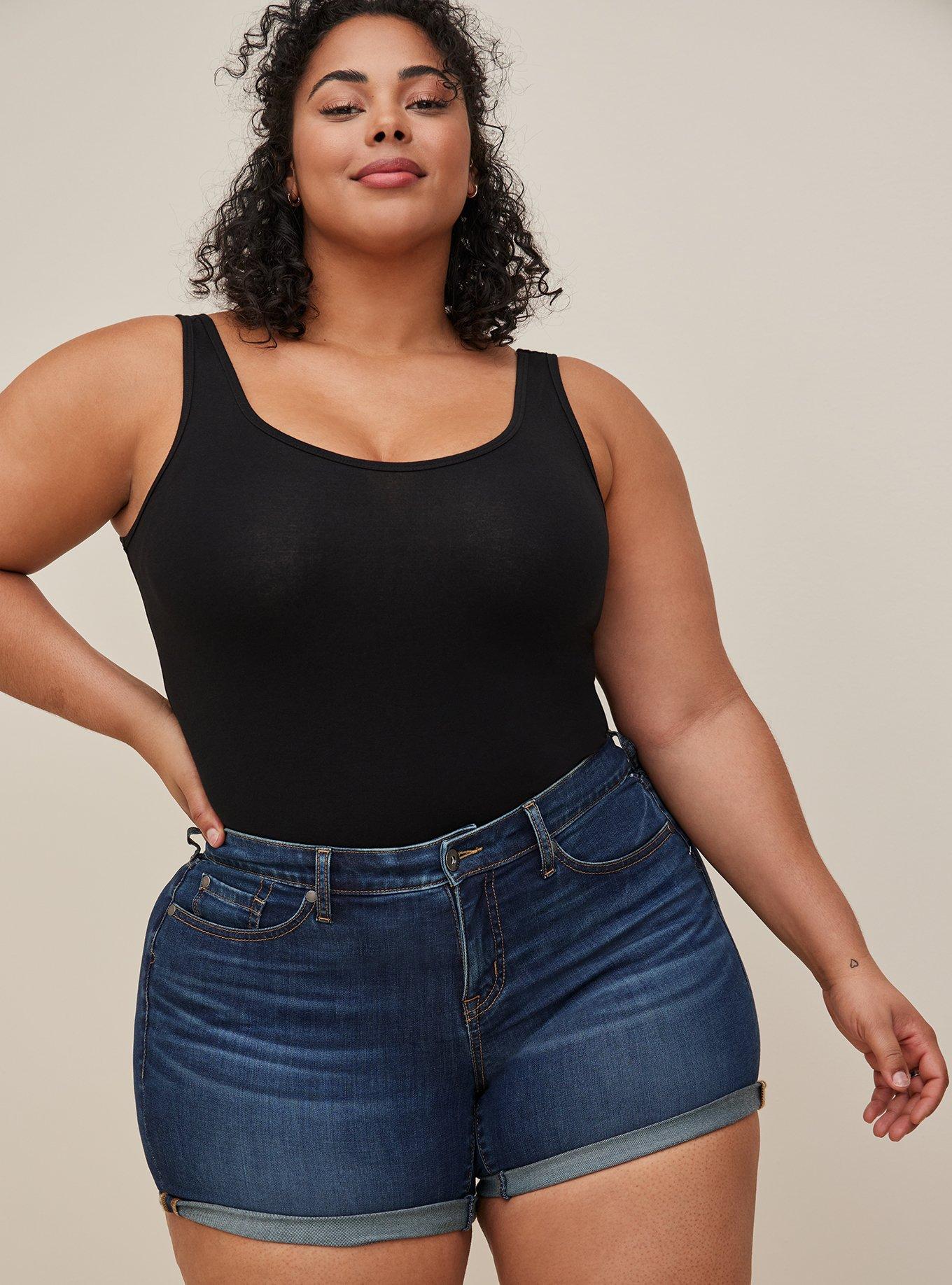 I just bought these shorts and the did not disappoint. Great fit and length. My shirt is a soft black Tee by Torrid is a must have as well.