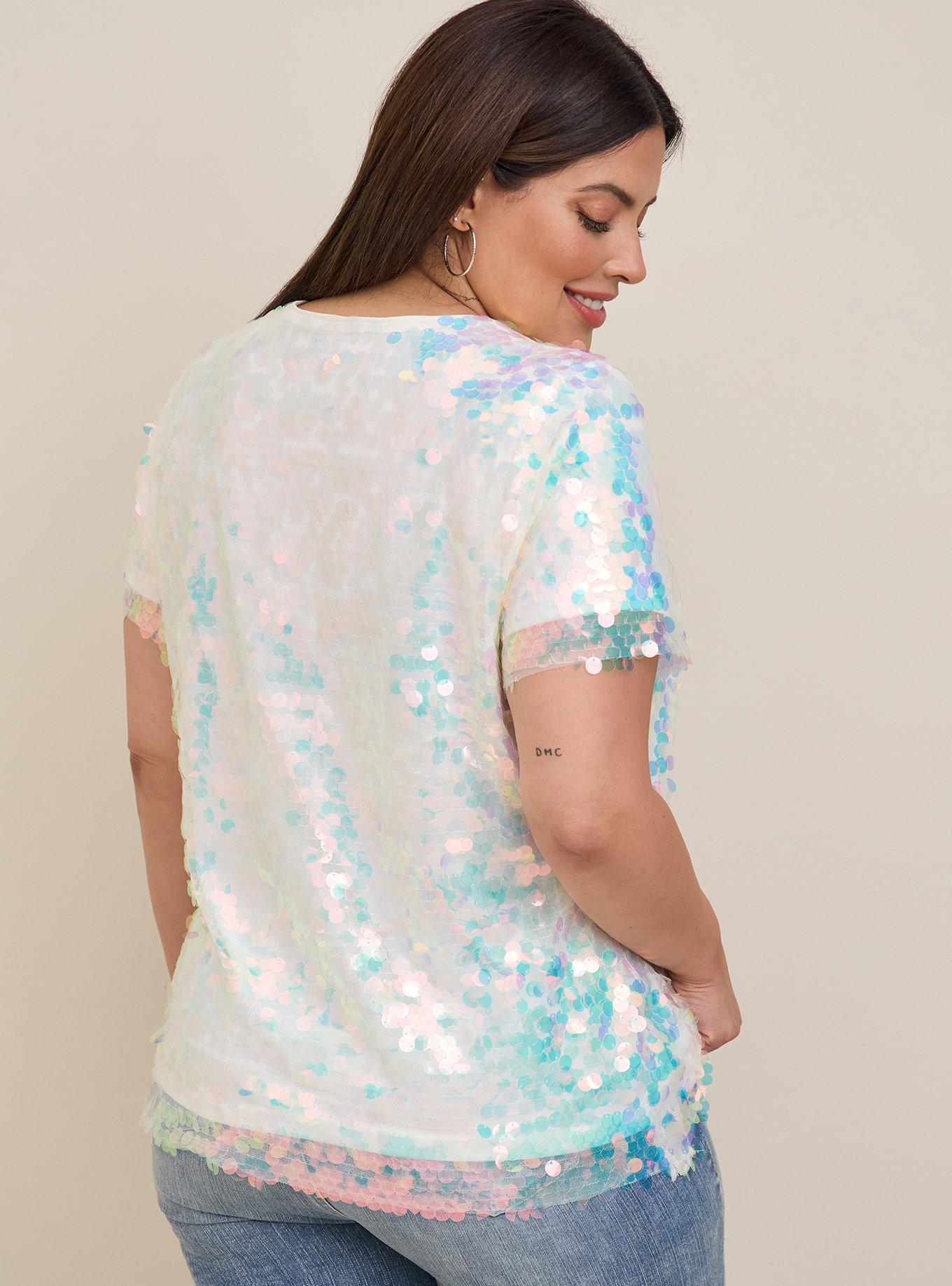 Rated 5 out of 5 by from Shiny and Colorful I had to get this top! I love the color iridescent. I got a size 00 and it fit perfectly. My only critique is that it hangs longer in the front than I’d like. The sequins cannot be tucked in. I wish the front ended slightly higher on the stomach - not crop top high lol, but slight higher just below the bell button. But this top is perfect for parties or just looking cute!