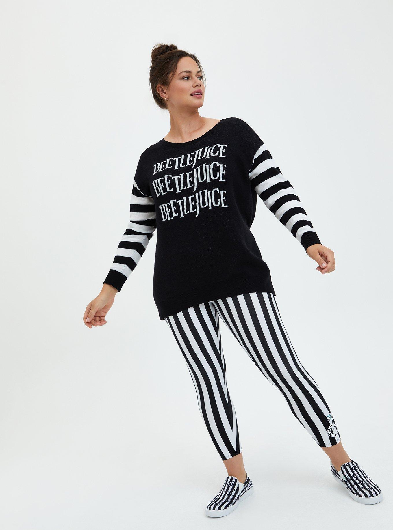 I love this sweater. It fits TTS, is attractive and eye catching. Make sure to wash in cold water and line dry. The black can easily fade onto the white parts. I’m wearing it in a size 00 in this photo with the matching crop Beetlejuice leggings from Torrid, and with the matching Beetlejuice shoes from Torrid.