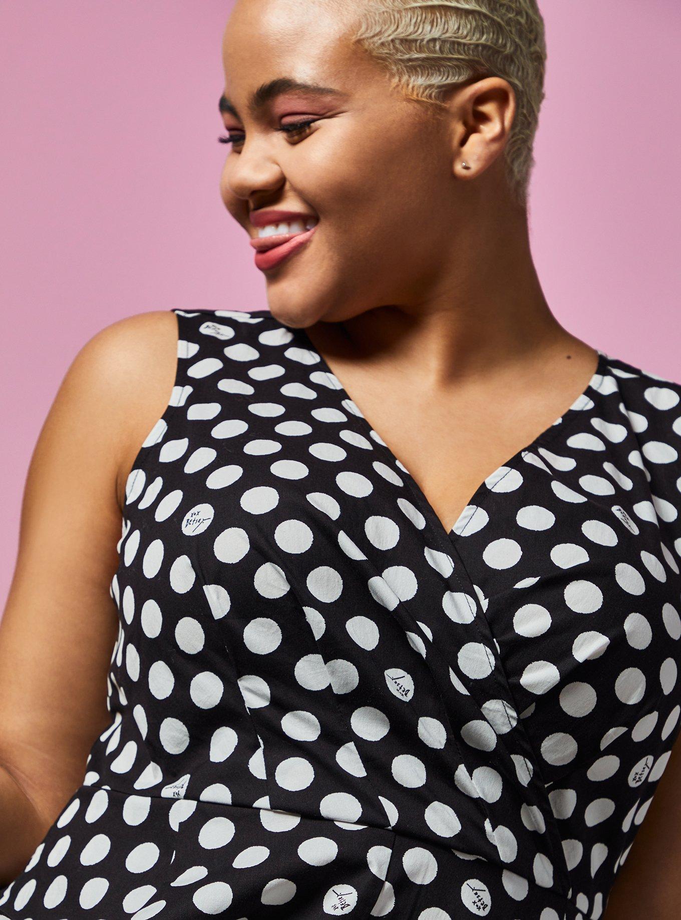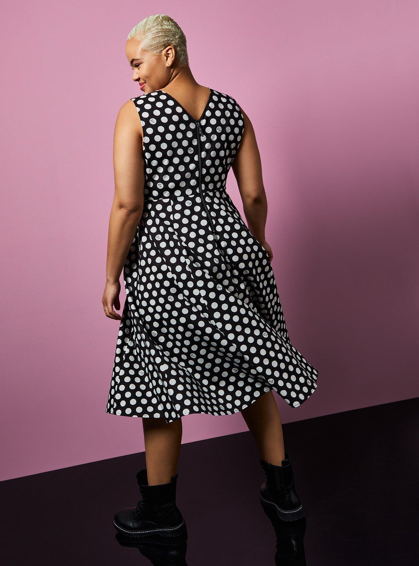 Rated 5 out of 5 by from Polka-dot Perfection I LOVE this dress. The classic black with white polka-dots will remain a staple in my closet for a long time. I am very large busted so my usual Torrid size fit me perfectly. If you aren't endowed in that area, the bust area might run a bit big. If you are are all handy with a sewing machine, you could probably fix it. The dress is fun, flirty and looks great with a crinoline underneath it. I will be wearing it with lace cropped cardigan and ballet flats for work functions or with my cropped denim jacket and combat boots for a casual look.