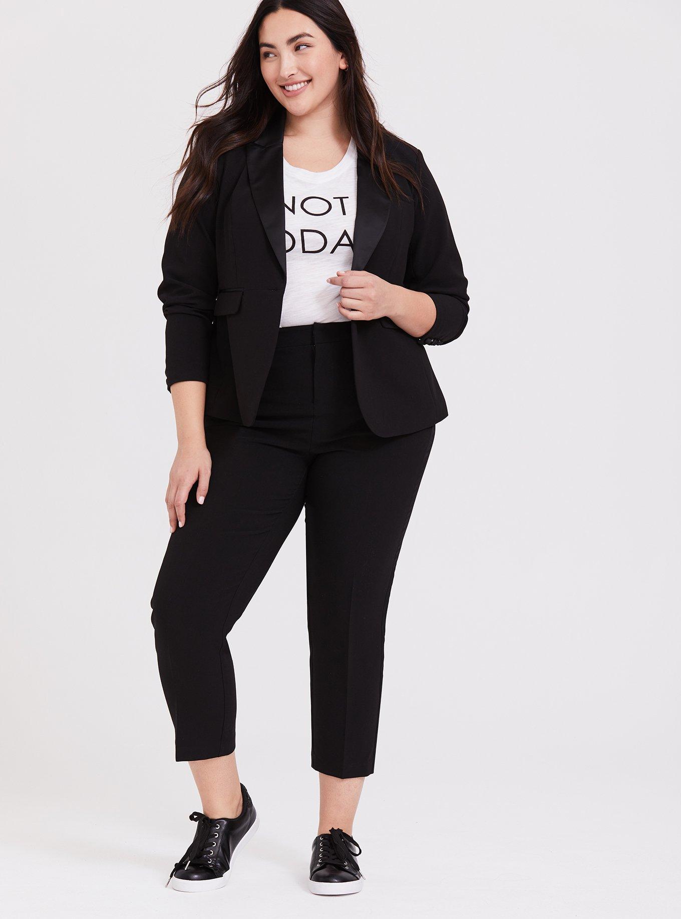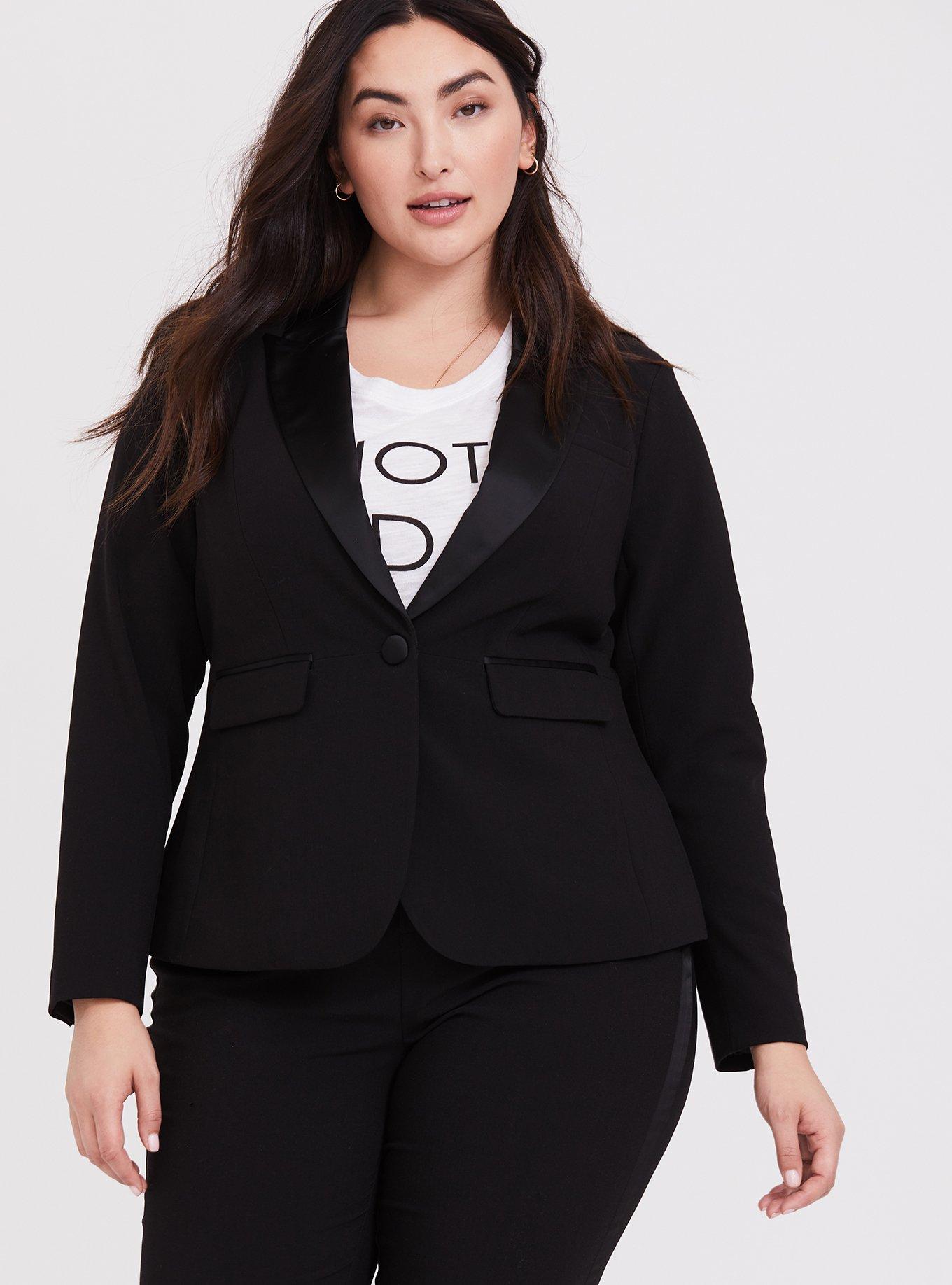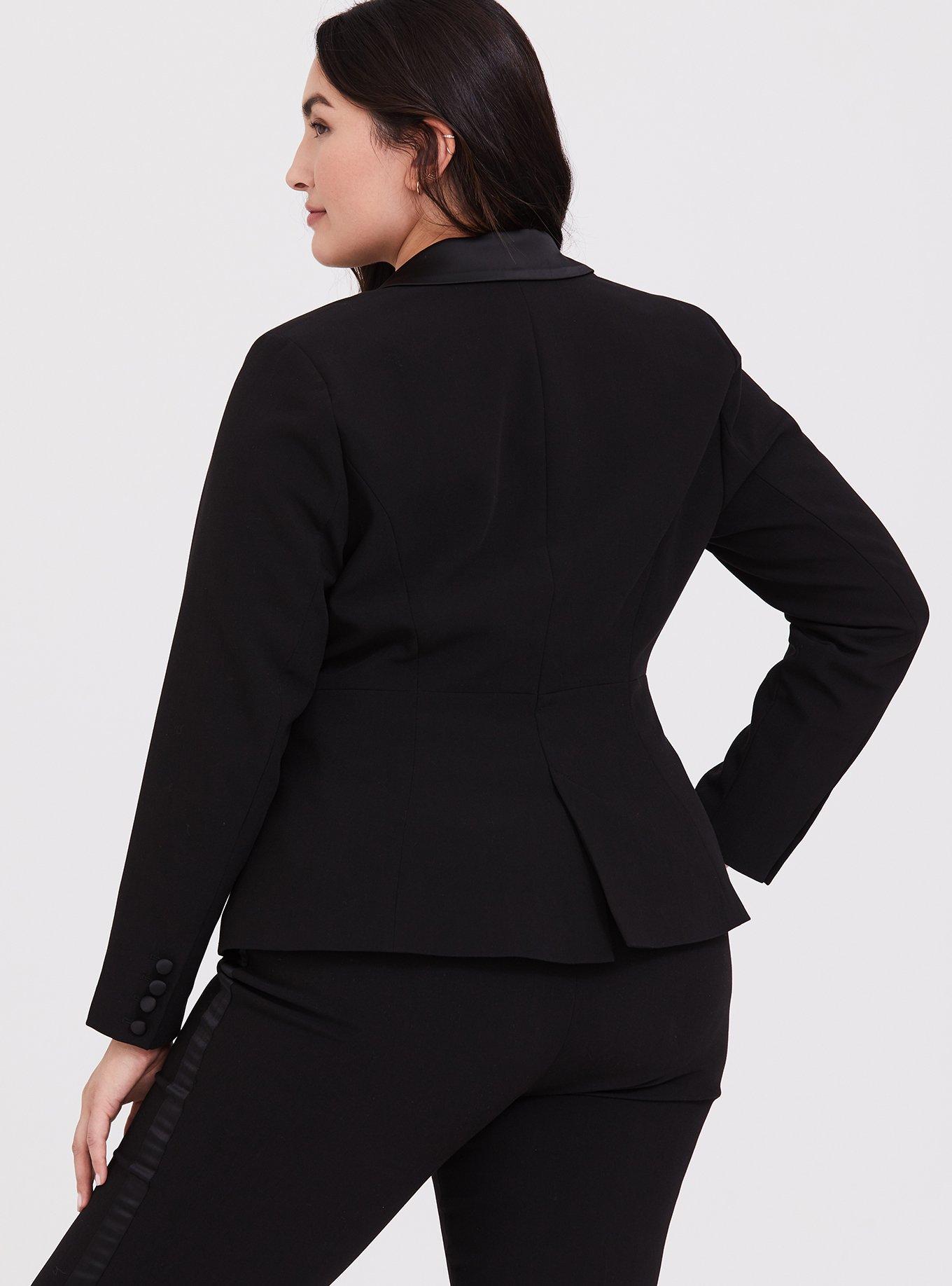 Rated 5 out of 5 by from My favorite tuxedo jacket ever I love the way this jacket feels. It shapes to my curves. Beautiful with my red lace dress, and nice with my skinny jeans.