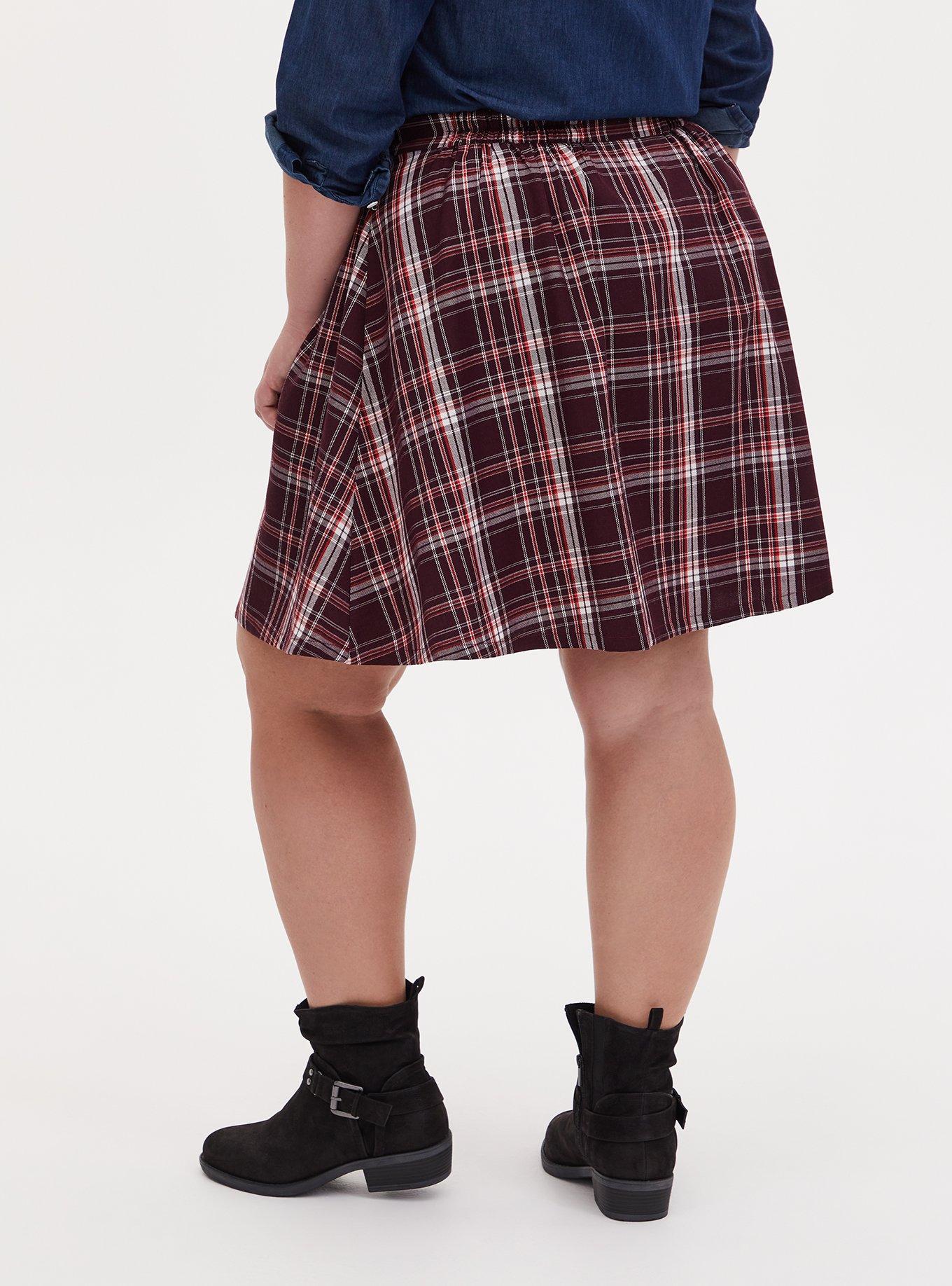 Rated 5 out of 5 by from Perfect for Fall I bought this skirt in a size smaller than I normally wear because Torrid skirts typically run long on me (I’m 5’4” for reference). I’m glad I did! It’s the perfect length, a few inches above my knee and still covers my butt. I’m normally a size 1 in leggings, 18 in sky high skinny, and 1 in dresses. I got this in a size 0 and while I can’t get it over my large hips, I can easily pull it over my head. I will say, if my waist was any bigger this would not have worked. But it is cute and PERFECT for fall.
