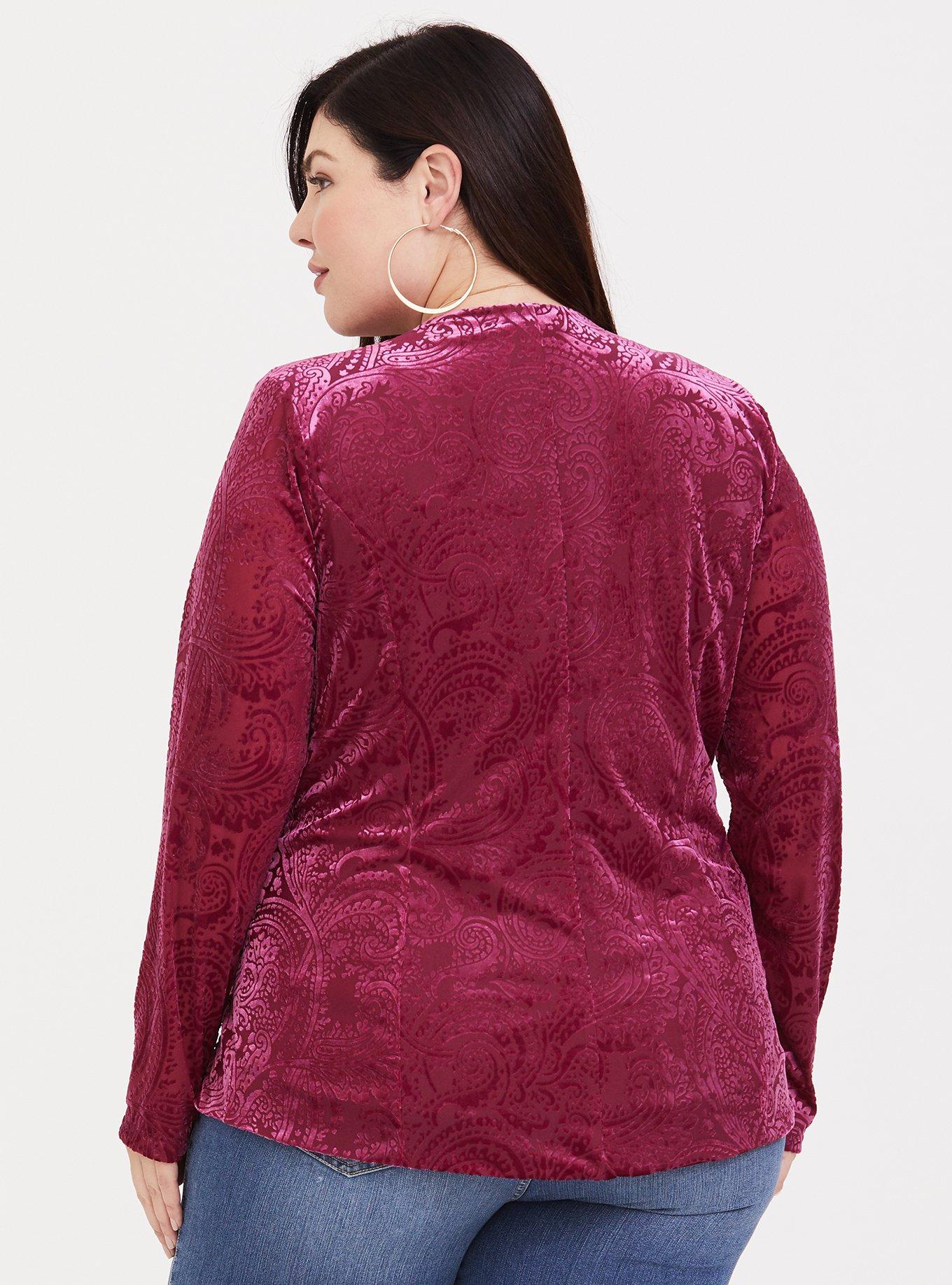Rated 3 out of 5 by from Not what I expected First of all, this is raspberry, not anywhere near red. It's still a pretty color, but not what I expected. Second, it runs small. I'm a 0, sometimes a 1, and only a B cup, so I ordered this in a size 1 since it's a layering piece. It's tight. Not impossibly so, but since it lacks any structure, it fits oddly. The front comes nowhere near to closing. Thirdly, and definitely the deal breaker for me, the burnout effect means the sleeves are mostly sheer. Forget about wearing anything but a camisole under this. Any kind of sleeve would be visible. It's still a pretty piece, which is the only reason I decided on three stars instead of two. The other problems were just too much for me to overcome.