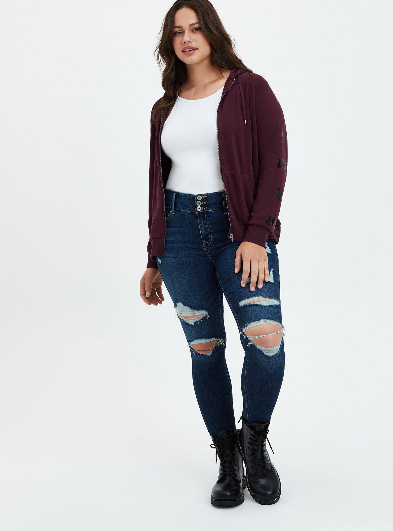 I bought this a few weeks ago, haven't had much use yet but when I tried it on I knew I was gonna LOVE it. It's the perfect hoodie material and it's a ZIP UP!! Love the color. I love the villain line and I hope torrid continues to bring us more zip up hoodies.