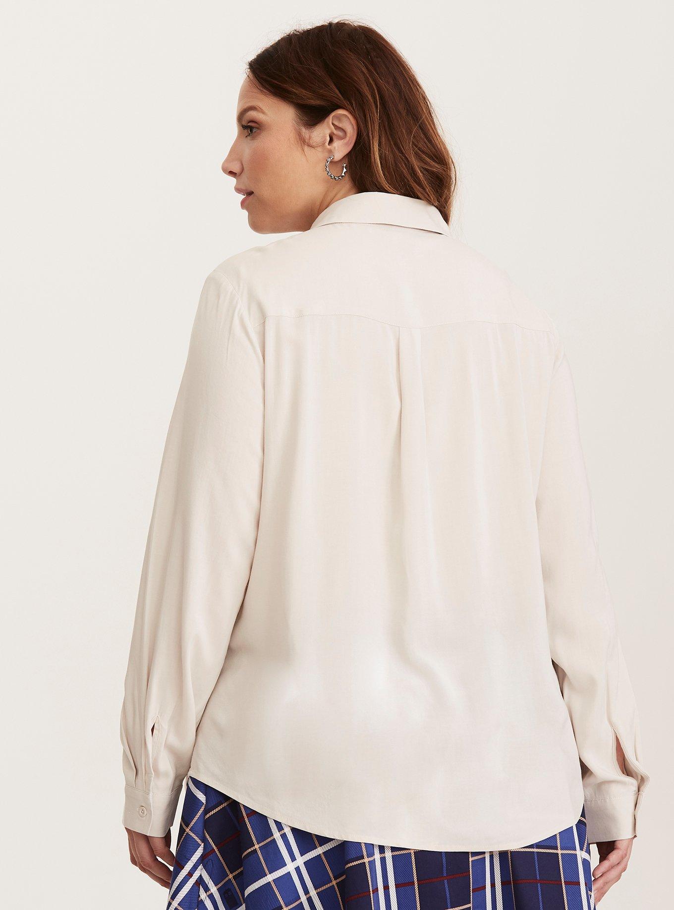I read the reviews and decided to order up well it was to big so I return it and order my size and I love it. Can’t wait to pair it with my torrid jeans the shirt is beige by the way