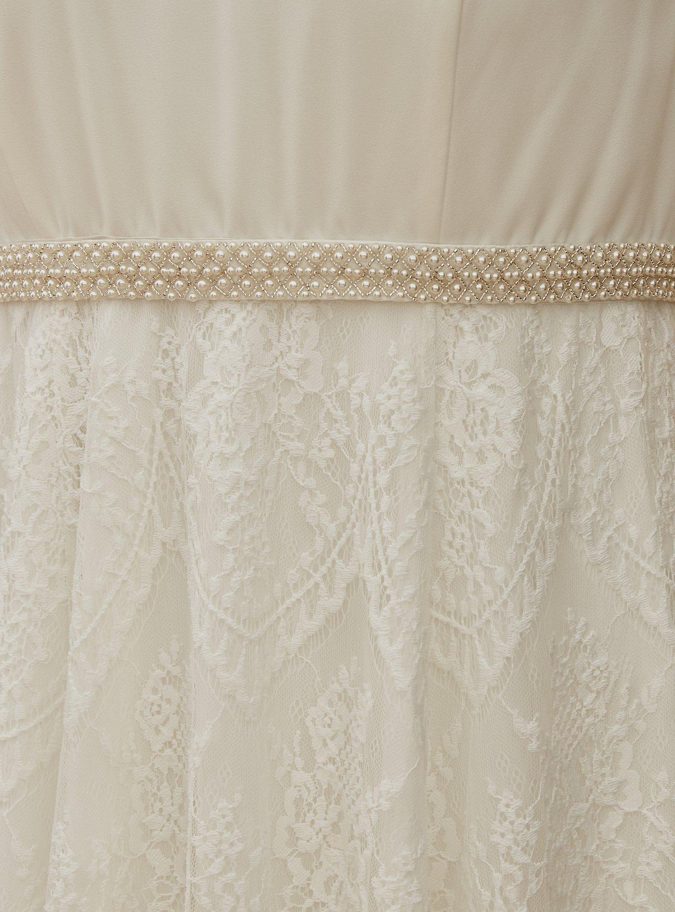 Rated 5 out of 5 by from more than meets the eye I had a "dream" wedding dress in mind, however for several reasons that dress was no longer a viable option, so I started looking for a "back up" dress for my upcoming wedding, and that's how I found this little gem. At first glance it looks like a pretty enough simple dress, but it is so much more. There's a classical elegance to it and it truly made me feel like a bride. As soon as I tried it on I started crying, my "back up" dress had just become my new "dream". It fits beautifully, feels very well made and high quality. The lace skirt is so beautiful, looks almost vintage. The pearl sash is a great compliment to the dress and combined with the lace pattern it gives off 1920's vibes. It is a very long dress though, I'm 5"3' and will need to have it hemmed , but that doesn't take away from the beauty and magic of this dress. Pictures don't do it justice, this dress is simply stunning.