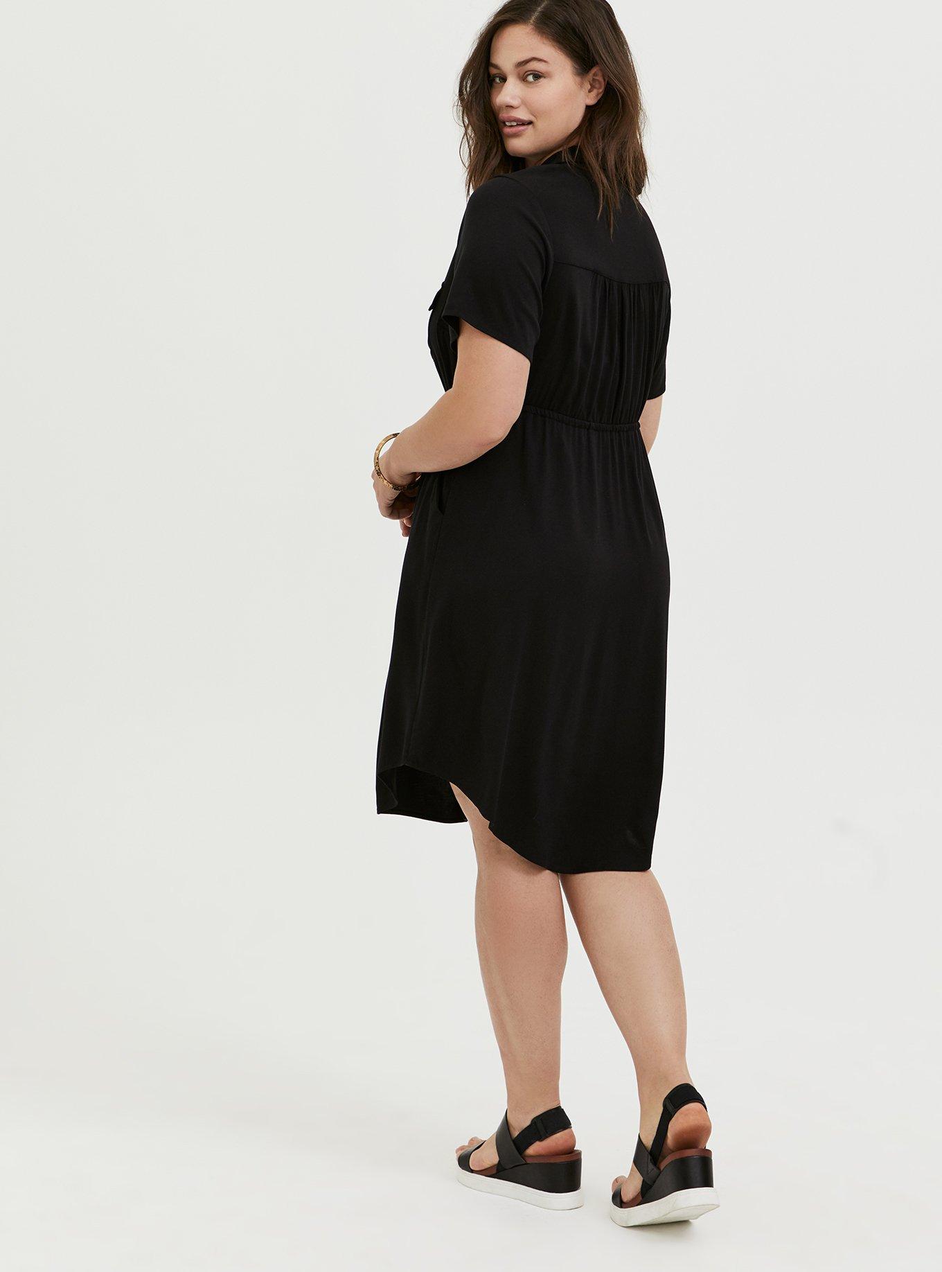 I love the versatility of this dress. I can dress it up with accessories and cute shoes for work or play, or dress it down with some sandals or sneakers for a more casual look. Regardless it's really a must have! Fits me great in my usual size. This dress has a little more fabric and length on the bottom vs other Torrid shirt dresses, so no need to size up. I'm 5'9" and the front hits me mid knee but the back is a bit longer, almost like a high low situation. Flattering fabric, not clingy. Fits nicely over my D cup chest without anything popping out. Highly recommend! Wish there were more colors!