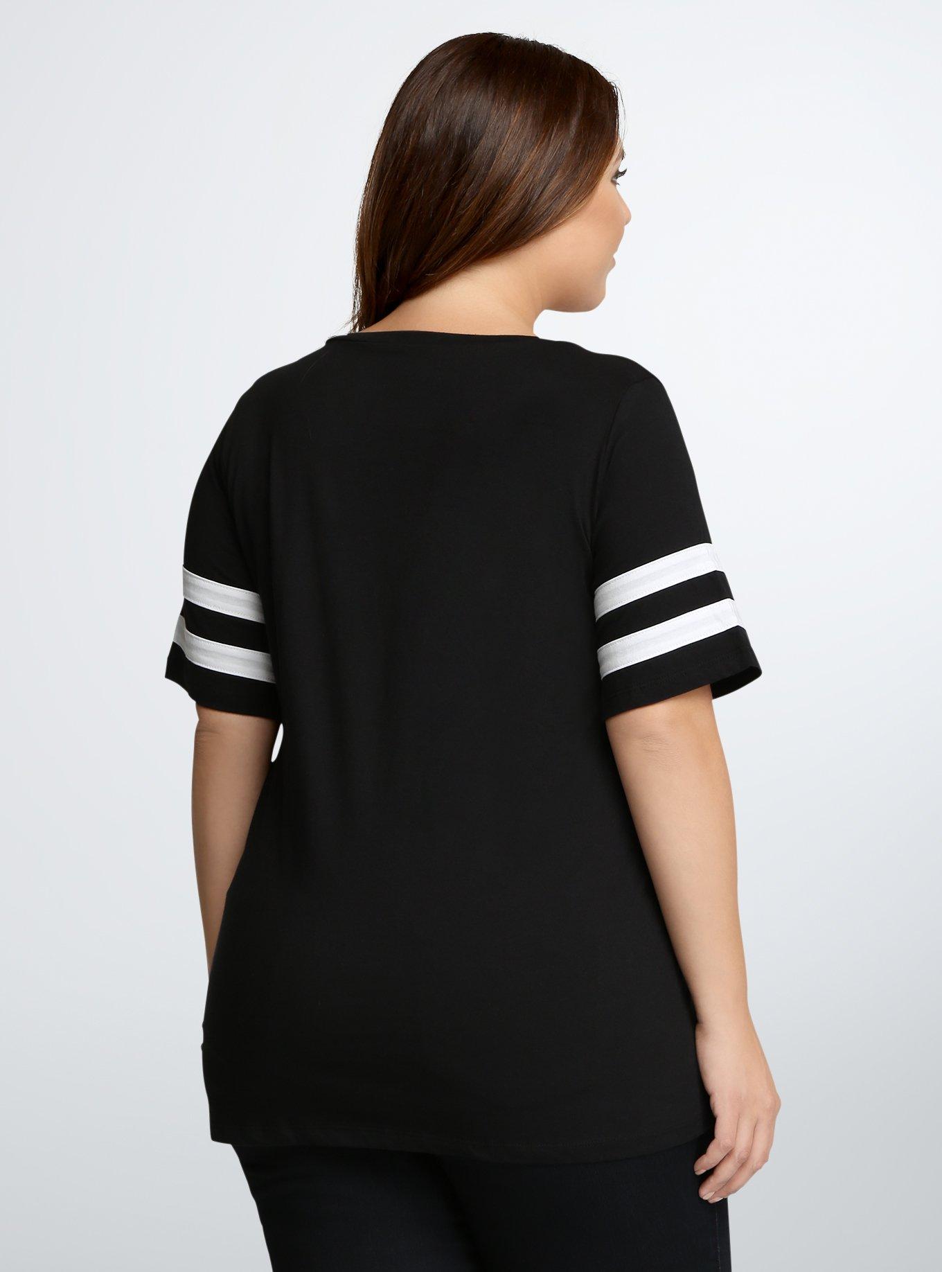Football season is upon us, and I am a die hard 49er fan. It's hard finding plus size sports gear thats flattering. Torrid is my go to place for my clothing. So when I saw this top online I was soon excited. I ordered it immediately. Torrid, you did not disappoint. This top is true to size and the colors are vibrant. The sleeves are a perfect length, this picture of the model is pretty accurate. The length overall with the shirt is great. I'm 5'10" and the bottom hits under my butt. I'm heavy up top so the V neck is very flattering to my shape. The material is thin and breathable. All in All, I have found my favorite shirt for the season!!!