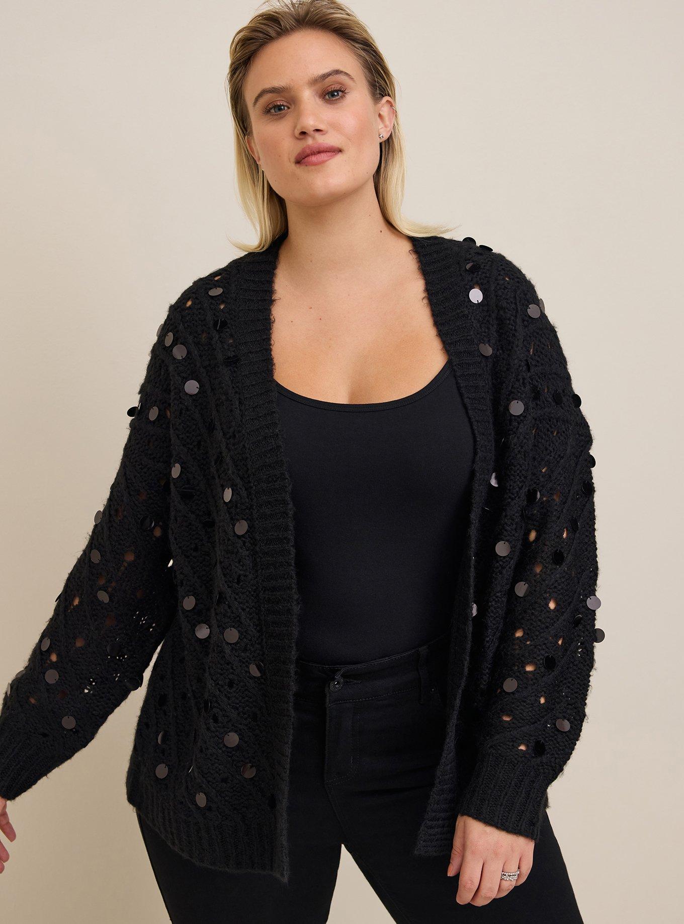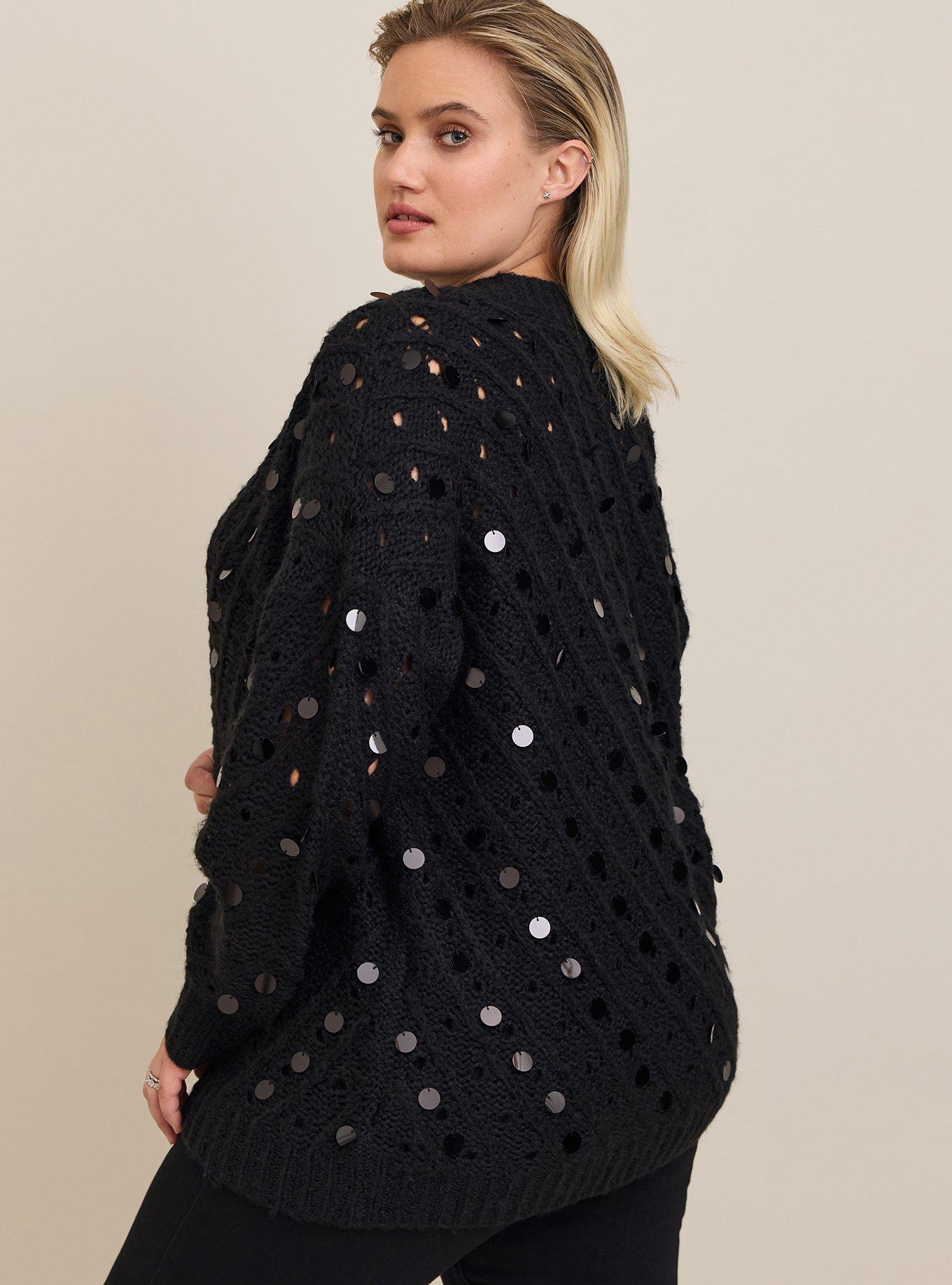 Rated 5 out of 5 by from Beautiful! I had a similar sweater when I was a teen, but instead of the sequins mine had pearls sewn onto it and it was a pullover rather than a cardigan. When I saw this it made me remember my old sweater and how much I loved it so I had to have this updated version. I love that the sequins are black so that it’s more understated and gives a bit of something extra when the light hits it. It’s well made and exactly as pictured. I ordered a 2 and it fits true to size. The body of it is slightly oversized as seen on the model and the sleeves are the perfect length. I usually have issues with Torrid’s long sleeved tops hitting above my wrists, but this sweater is perfect. Very happy with my purchase.