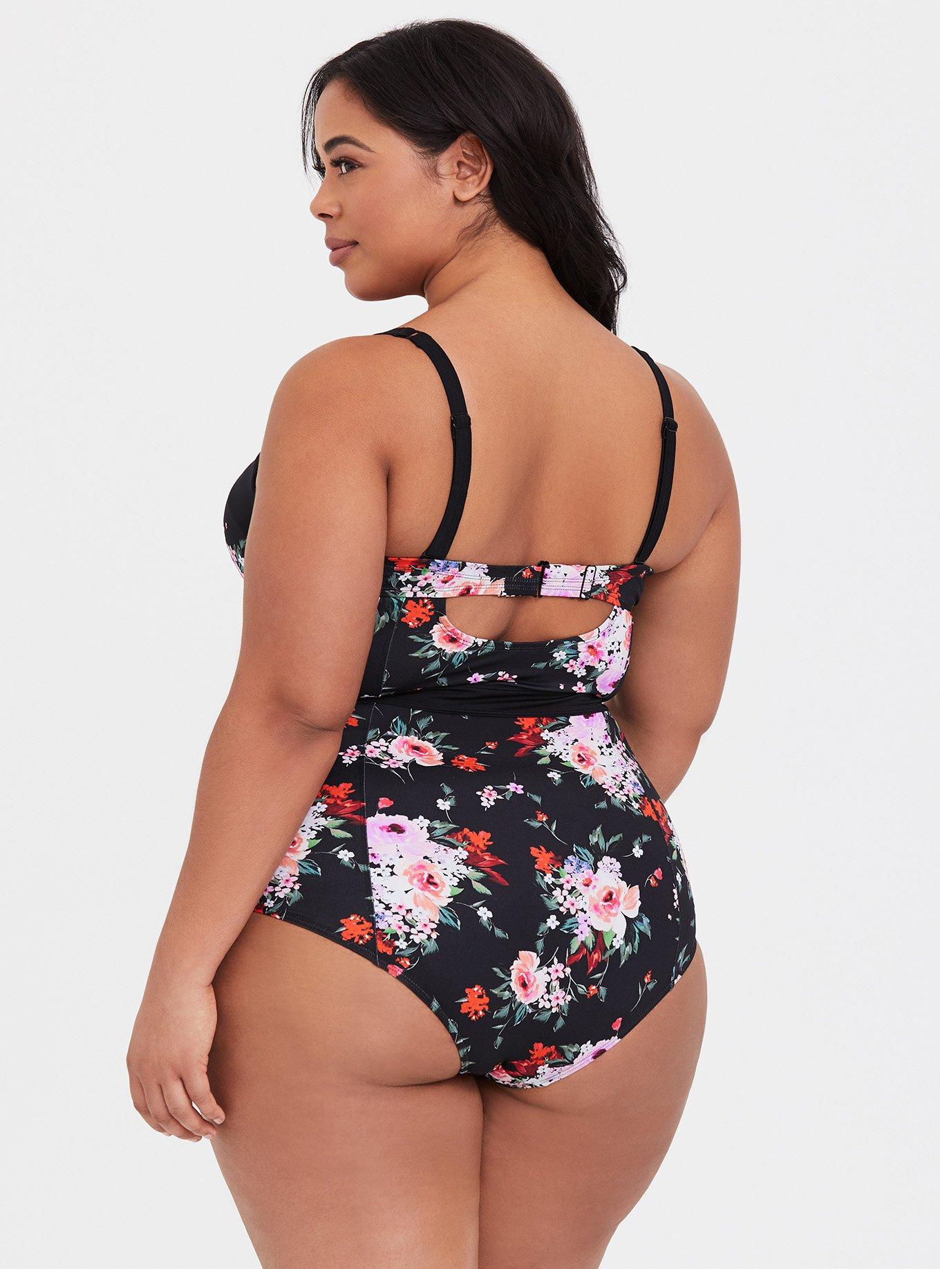 Rated 5 out of 5 by from Super sexy, but not for a busty woman This is a well-made swimsuit and super flattering on me. The dark floral print is so pretty! I feel very tucked in everywhere but (as noted in other reviews), the breast cups are on the small side, so this is not a suit for a busty woman. I'm a C cup and I'm filling them out and then some. I did notice that the suit fits better if the straps are not crossed in the back, that seems to make the breast cups fit even smaller.