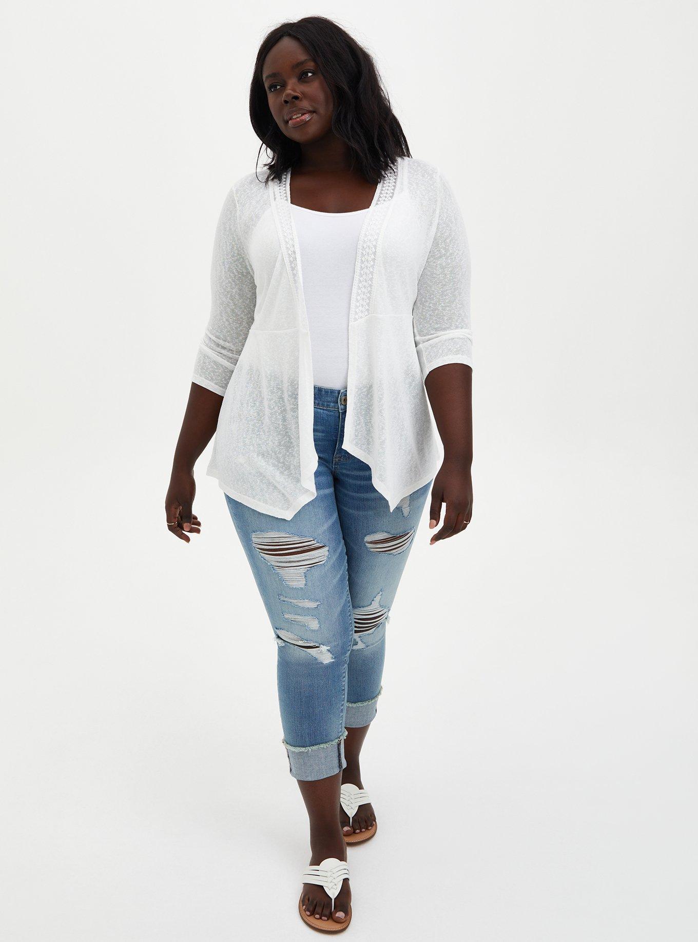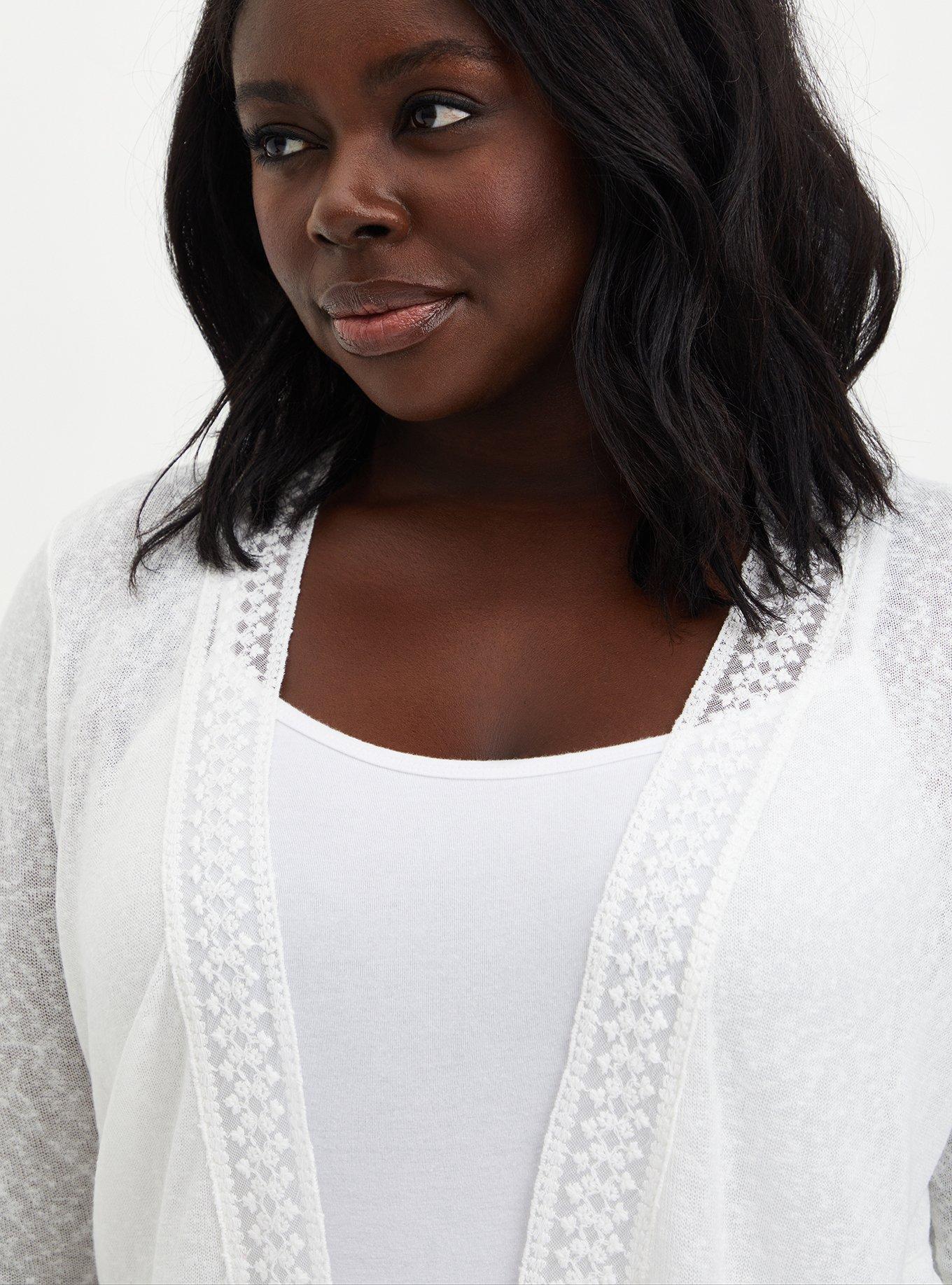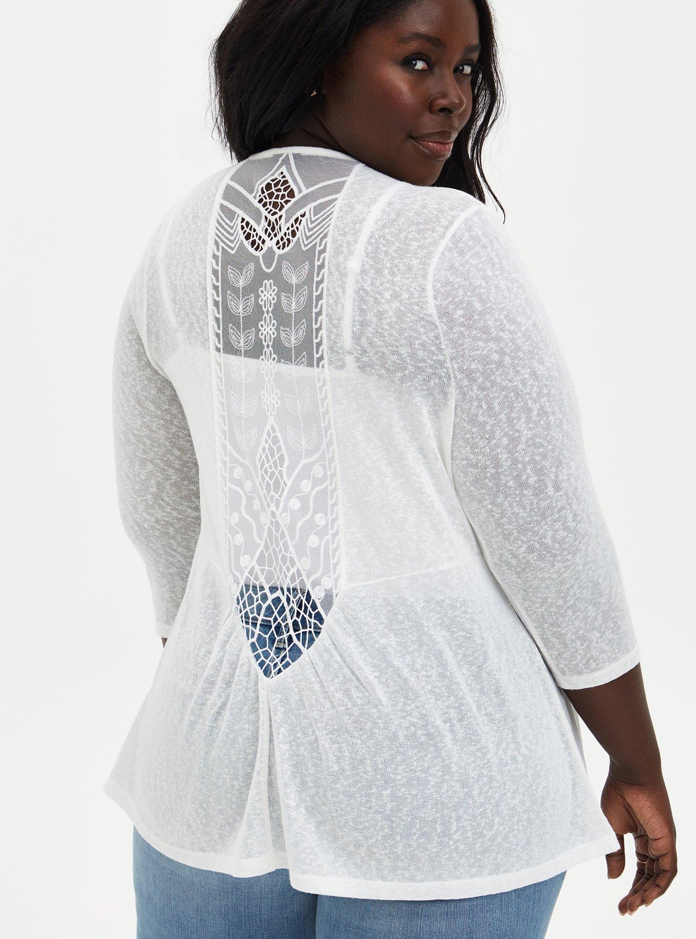 I originally bought the black sweater in this style and loved it so much that I also bought the white. This sweater is super lightweight & breathable for summer. Gives just a bit of warmth on my arms when the AC gets chilly. I love the lace insert on the back of the sweater & the 3/4 length sleeves. The triangle shape of the lower front side of the weather adds more uniqueness to the style. Can't say enough good things about this sweater!