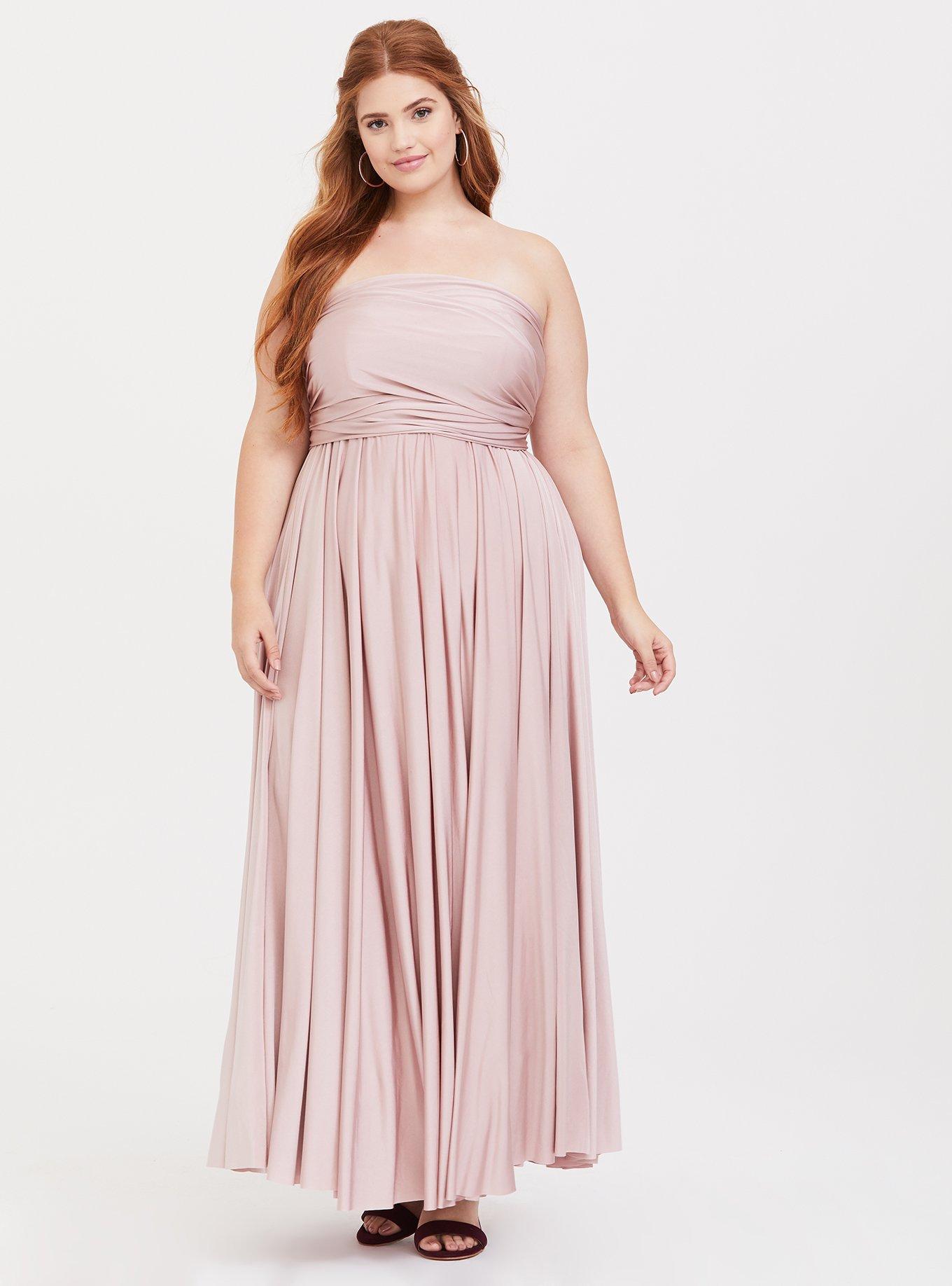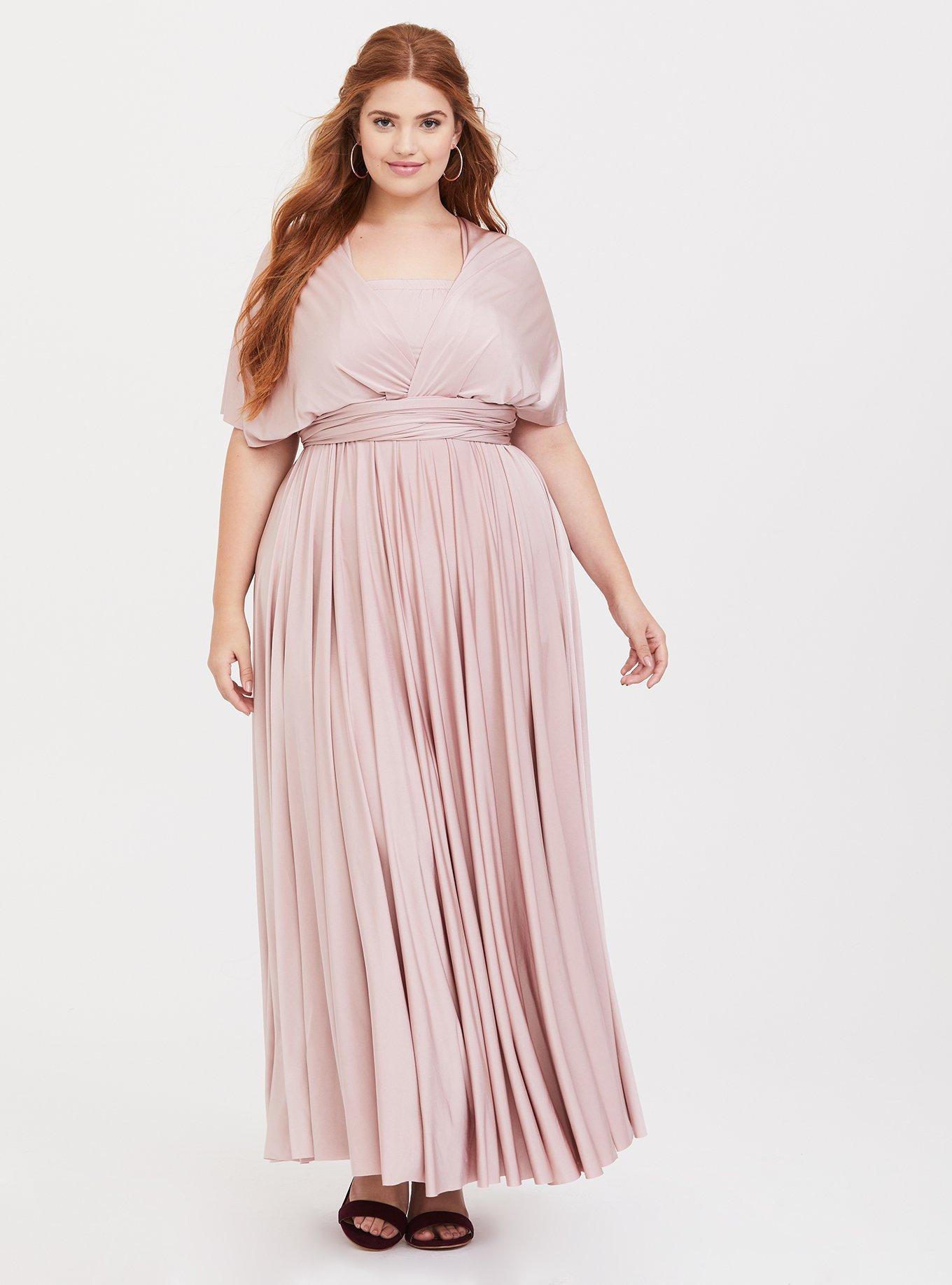 Rated 5 out of 5 by from Beautiful fit; beautiful color I purchased this dress as my bridesmaid dress for a close friend's summer wedding. I also own the navy blue one in this design also and am obsessed with that dress too. The fabric is a heavy but not in an uncomfortable way, but rather, feels like quality. It's a has a very Grecian fit and is very flattering to the figure. I purchased this dress in a size 1, and it is true to size. I would have sized down if I had a smaller chest size. For reference, I'm a 38D. Thus, if you typically wear a 0-1 in Torrid tops, I would size down if you have a smaller bosom. I also had my husband photograph me in the light with the dress. One reviewer called the color "drab", in which I disagree. It is a softer, dusty pink almost champagne. It photographs beautifully in the light, and it has a beautiful shine to the fabric. Anyone with a pink undertone their skin might be washed out in the color, but there are other color options for this dress for those who do. The bride also loves the dress and even might buy her own in a different color to have for herself! Two thumbs way up! I look forward to wearing it at her wedding.