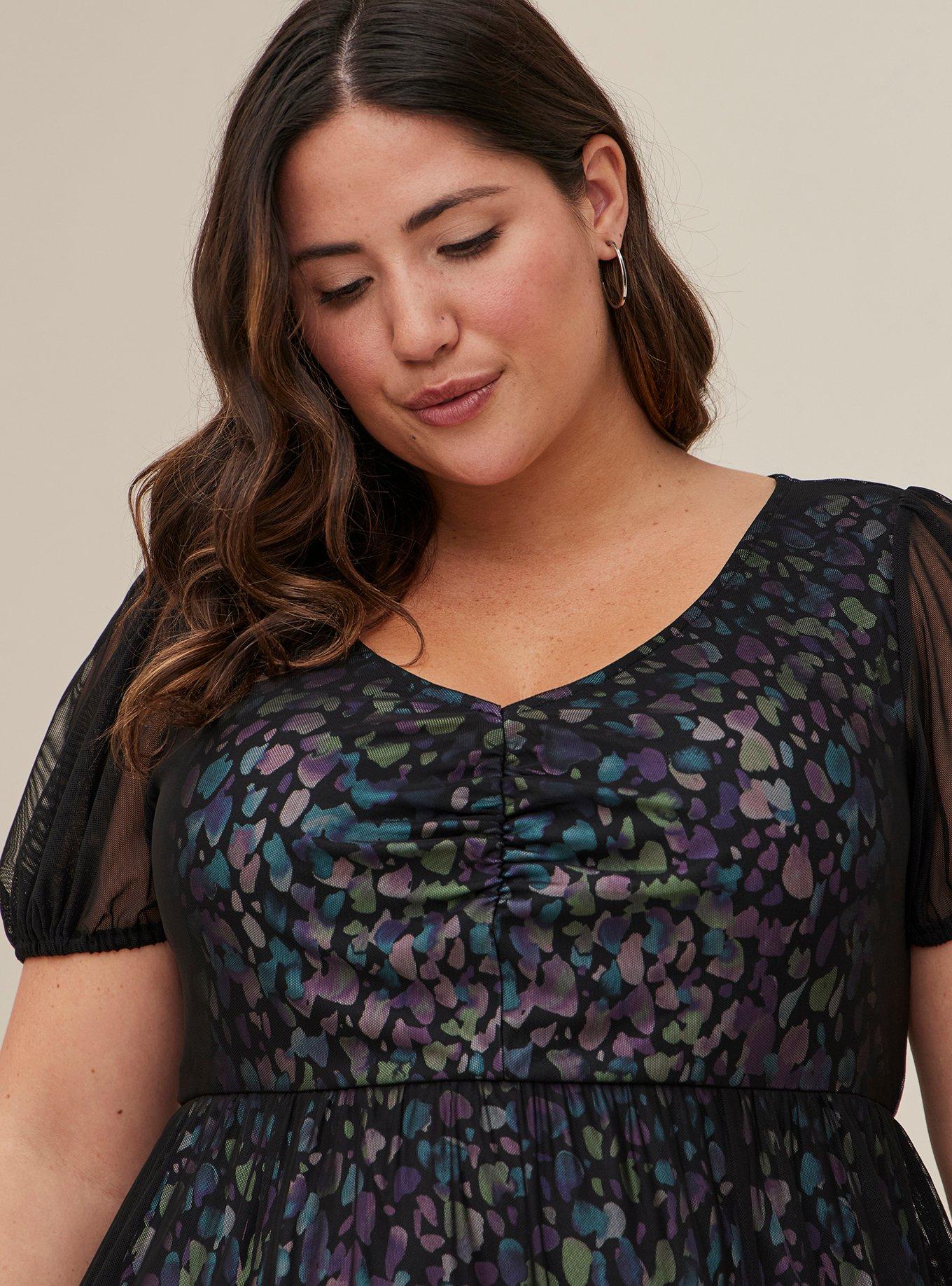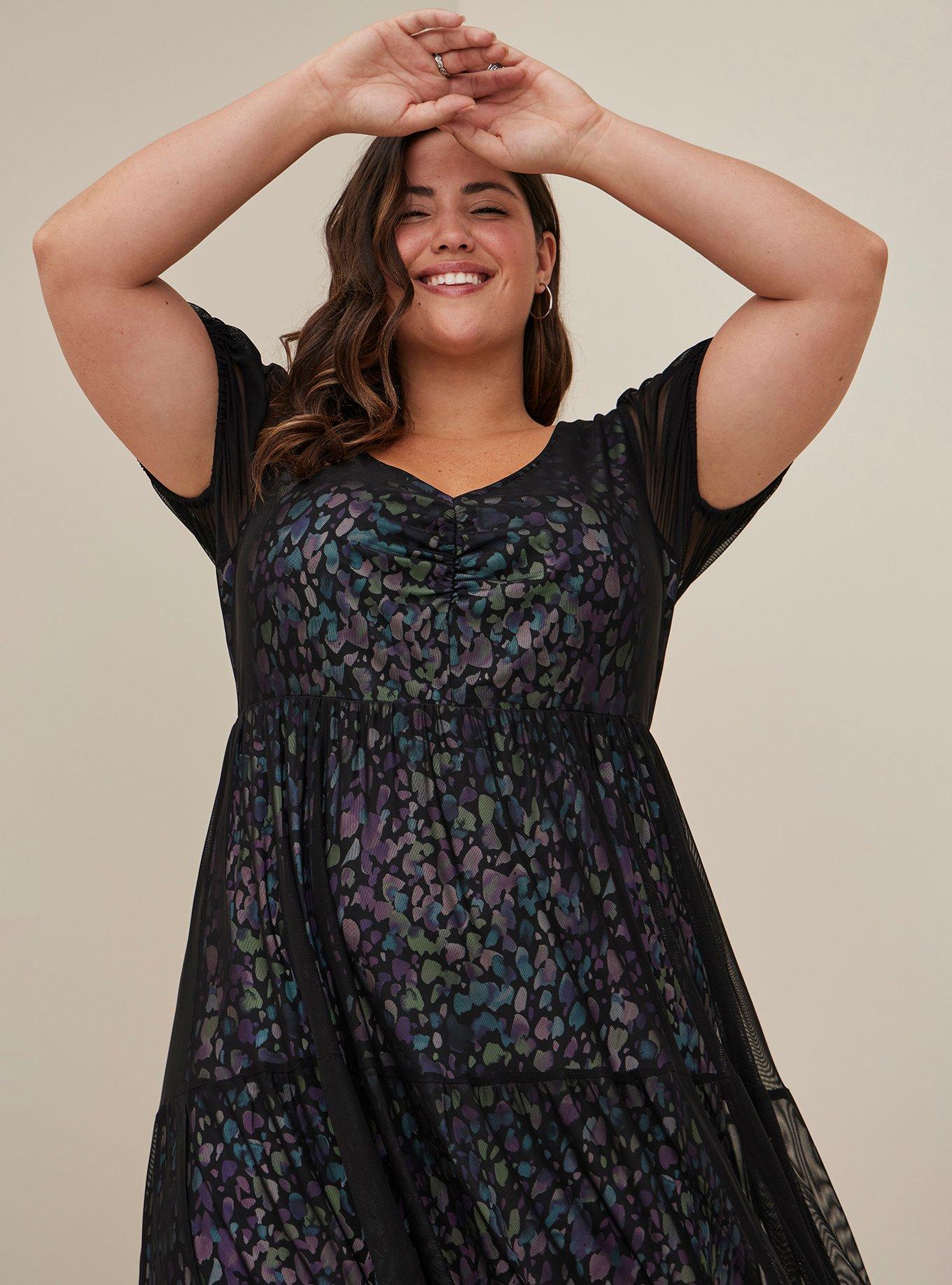 Rated 5 out of 5 by from Comfortable & colourful Love the colours & mesh detail. I have a large chest so wished stitching was a bit lower under the bust otherwise it’s a great dress. Wore 2x to my god baby’s christening with torrid shaper dress underneath so that it covered some of the v-neck cleavage area.