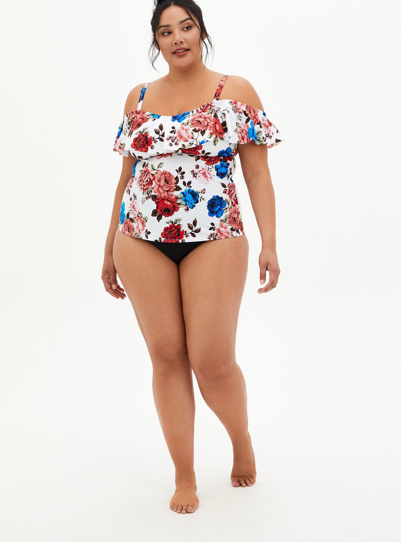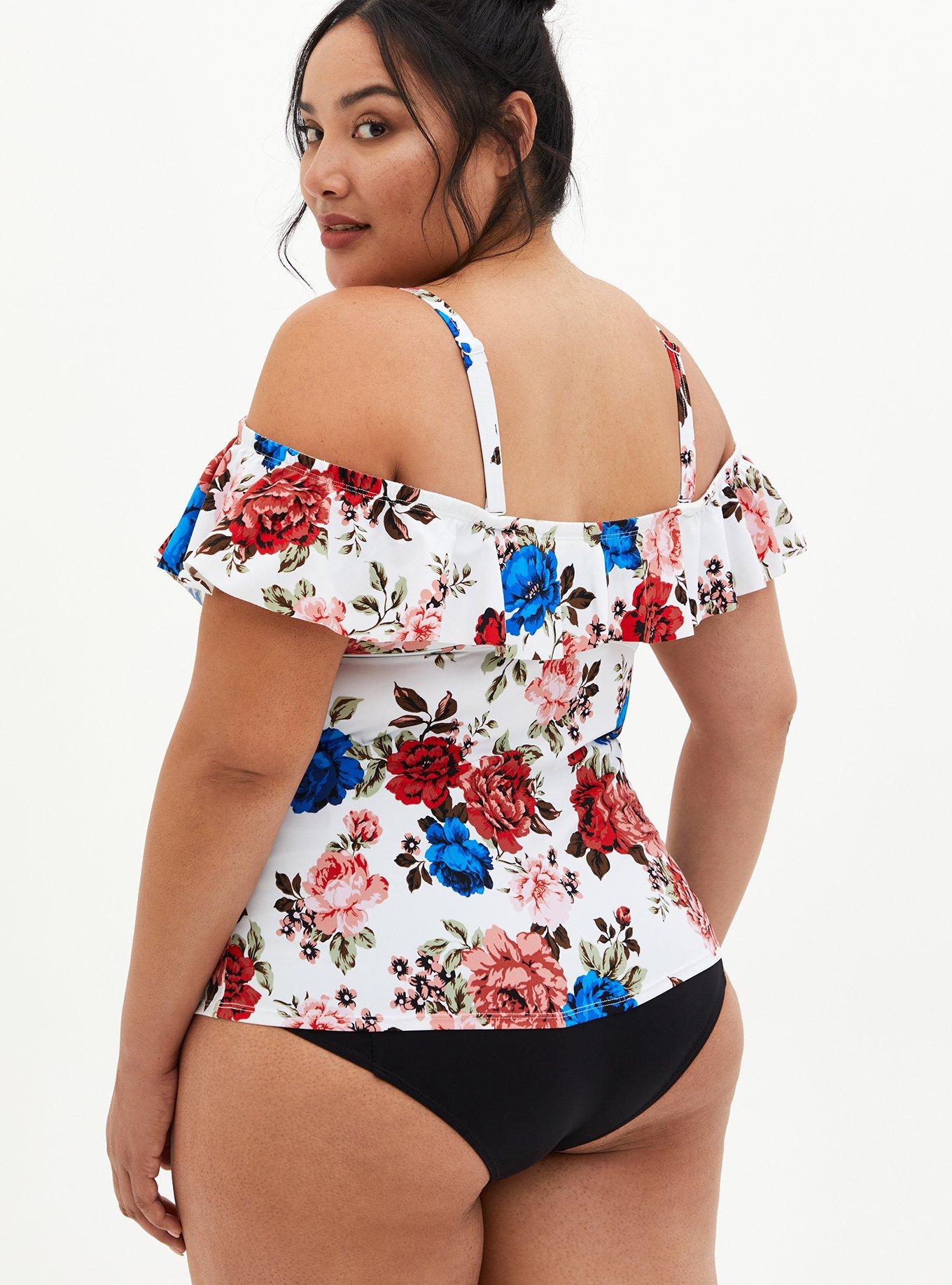 Rated 5 out of 5 by from Cutest swimsuit ever I bought this swim too in two different patterns I love it so much. I’m a barely b cup, so I wasn’t too worried about top support. I loved that I didn’t have gapping like I do with most torrid swim tops. The off shoulder “sleeves” and frilly design actually make it look like I have more boob than I do (which I like), and make this top a great piece to wear as it’s own shirt. The straps are removable too so the top can be worn strapless, but I wouldn’t recommend if you’re large chested because then there’s absolutely no support. The longer Tankini style offered full tummy coverage as well. I wish this style came out again this year.