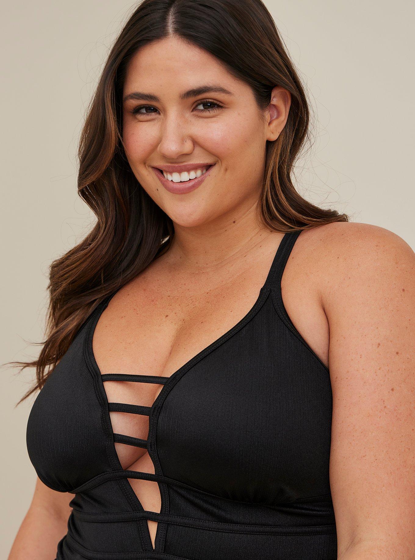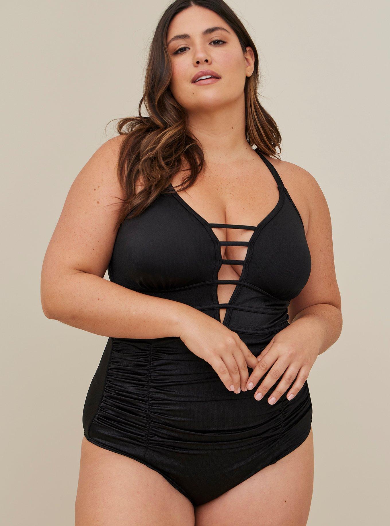 Omgeee love this swimsuit! Didn’t realize how good it looked on me until after I purchased it and wore it a few weeks later (didn’t try on in store , as my size is pretty consistent with all of torrid clothing)reason I love: the roushing at the tummy area and hold/support plus the girls look great by the way with the ladder neckline. I am sick that I missed buying the white and green they had of this style :( . I hope they bring it back for next year *fingerscrossed*