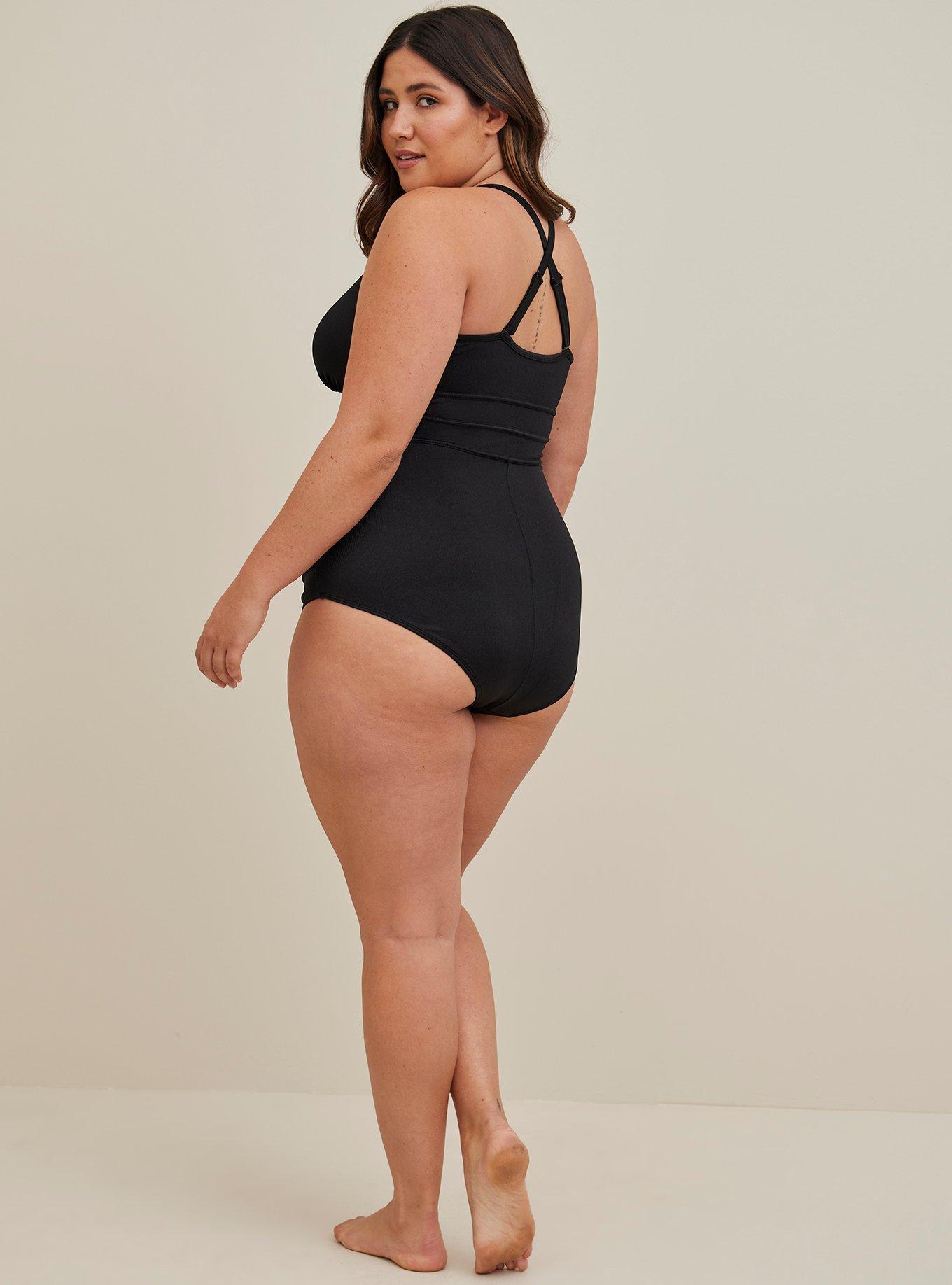 This is my first Torrid swimsuit and it is perfect! It's got good coverage but the low neck line allows it to still be cute. I love the shiny black material and it feels very high quality. If you're on the fence like I was, just do it. You won't be disappointed!