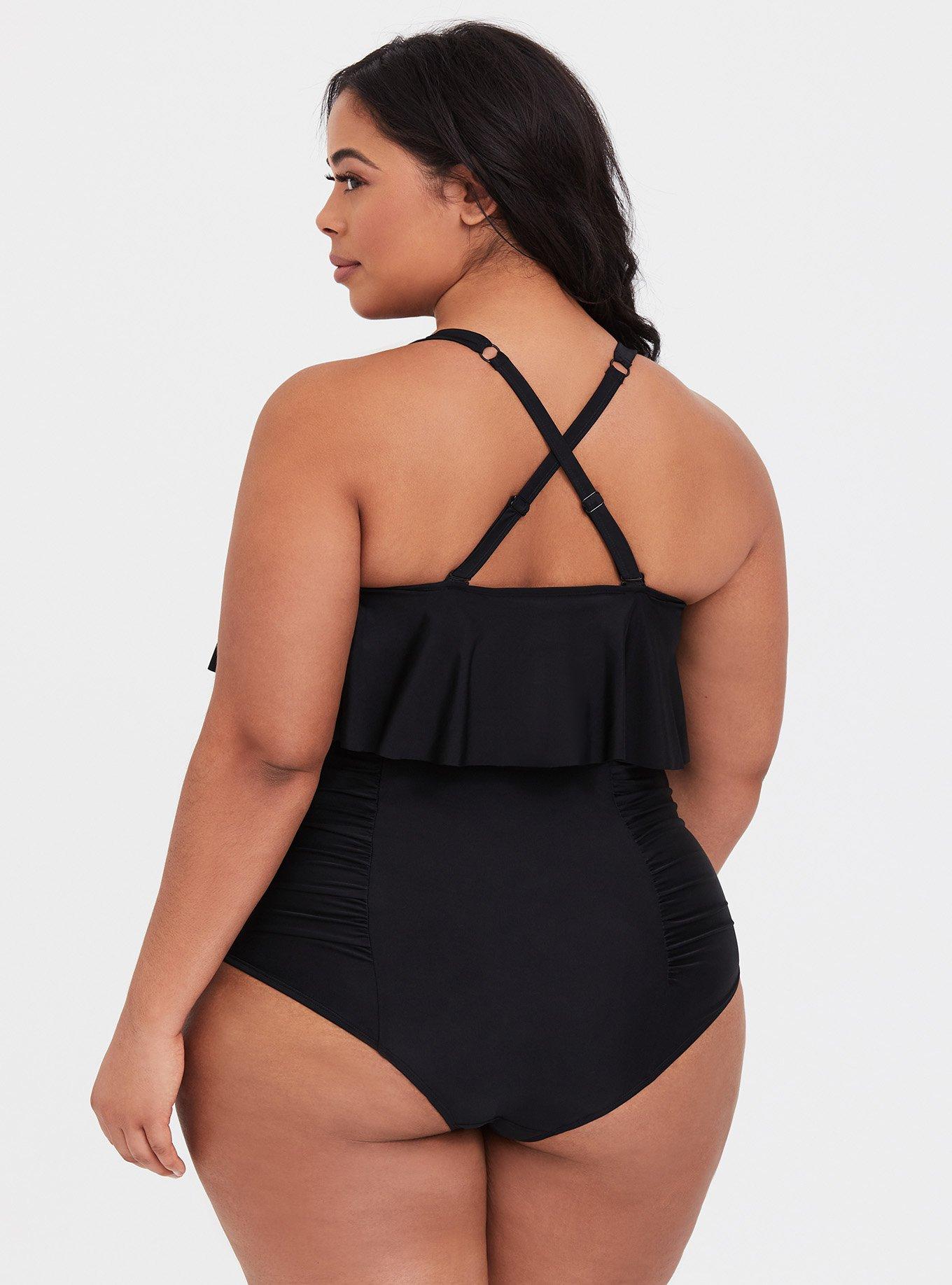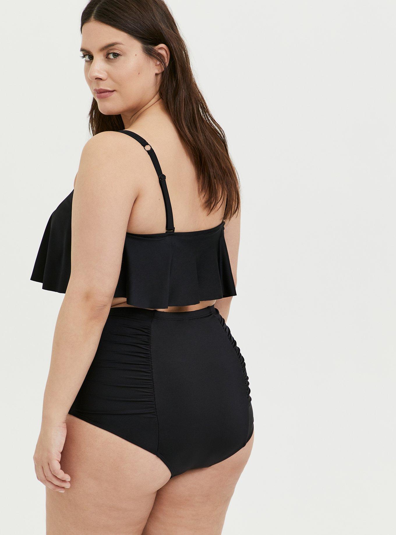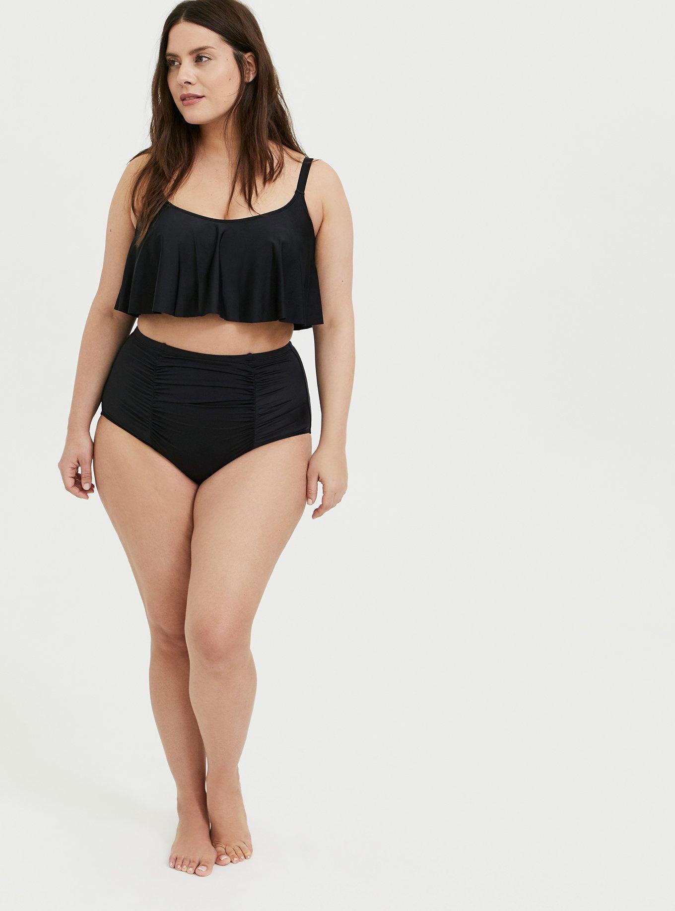 The flounce cut in torrid swil suits is amazing. It's comfortable like a sports bra, a little sexy if you snug it up a little and lovers the roll between the bust and top of their high rise bottoms.